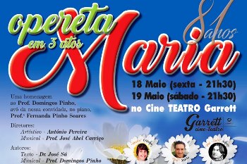 Hoje e amanhã o Cine-teatro Garrett acolhe a Opereta Maria escrita há 81 anos pelo professor Domingos Pinho. É uma iniciativa do Grupo Recreativo “As Tricanas Poveiras” e tem a particularidade de a neta do autor, Fernanda Pinho Soares, fazer parte da orquestra de 12 músicos que serão dirigidos por José Abel Carriço. De resto, todos os intérpretes são artistas amadores poveiros. António Pereira tem a direção artística e José Sá é o autor dos textos. O preço dos bilhetes varia entre os 7,5 e os 12 euros.