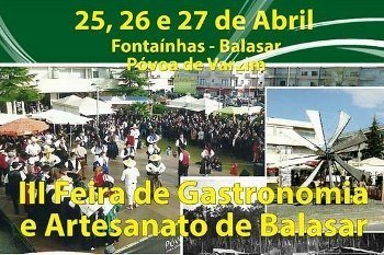 A III Feira de Gastronomia e Artesanato de Balasar realiza-se entre hoje e domingo nas Fontaínhas. A iniciativa pretende juntar o que de melhor existe nas tradições da freguesia nas áreas do artesanato e da gastronomia, aliadas a muita animação ligada às raízes folclóricas da região. A organização, a cargo da Casa do Café e da Casa Agrícola Loureiro Costa, conta com o apoio da Junta de Freguesia de Balasar, da Casa Escola Agrícola Campo Verde e da Câmara Municipal. A iniciativa conta também com atuações musicais: na sexta-feira, às 21h30, atua a Escola de Música de Balasar e há cantares ao desafio; no sábado, às 21h30, é a vez dos Cavaquinhos do Liberdade FC de Famalicão; no domingo, às 10h00, 12h00, 15h00 e 18h00 ouve-se o Grupo de Bombos de Santa Maria de Gémeos, Guimarães, às 16h00 atua o Rancho Folclórico de S. Pedro de Rates e às 17h00 é a vez do Rancho da Praça – Rendilheiras de Vila do Conde.