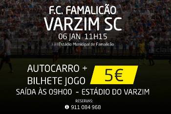 Os adeptos do Varzim que pretendem ir a Famalicão no próximo domingo podem fazê-lo por apenas 5 euros. É esse o valor que terão de pagar pela viagem de autocarrro e bilhete de ingresso para aceder ao recinto onde vai decorrer essa partida da jornada 15 da Segunda Liga. Como o jogo começa às 11h15, a saída do estádio varzinista está prevista para as 9 da manhã. Os interessados nesta promoção devem fazer a reserva para o telemóvel com o número 911084968.