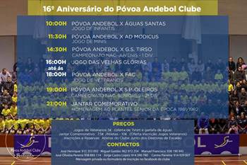 O Póvoa Andebol vai fazer este sábado uma longa festa do 16.º aniversário, longa porque logo a partir das 10 horas da manhã começam as iniciativas no pavilhão municipal, nomeadamente com jogos matinais de infantis e minis e à tarde de juvenis, velhas glórias e veteranos, antes de um dos pratos fortes: o embate dos seniores masculinos frente ao S. Paio de Oleiros. Depois, à noite, haverá um jantar com uma homenagem ao plantel senior de 1981/82 que militou na primeira divisão.