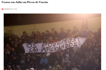O site TouroeOuro avançou que a Póvoa de Varzim vai receber uma Corrida de Touros no próximo Verão. Segundo o que foi revelado numa publicação naquela página online (na foto), datada do passado dia 26, o espetáculo tauromáquico “deverá realizar-se na segunda quinzena do mês de Julho, não estando ainda definido o elenco artístico”. A mesma fonte adianta ainda que “esta corrida pretende ser a resposta dos aficionados à atitude que estes entendem ser prepotente e ditatorial, por parte do Presidente da Câmara da Póvoa de Varzim, que decidiu proibir os touros na sua cidade”. A notícia não dá qualquer indicação do local onde irá decorrer.