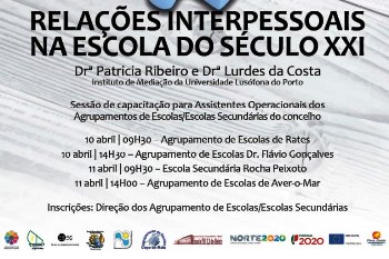 Hoje quarta-feira e amanhã assistentes operacionais de agrupamentos escolares da Póvoa de Varzim vão ter sessões de capacitação sobre “Relações interpessoais na Escola do Século XXI”, uma iniciativa inserida no projeto PVPV - Póvoa de Varzim promove valores. Hoje Patrícia Ribeiro e Lurdes da Costa, do Instituto de Mediação da Universidade Lusófona vão estar de manhã em Rates e à tarde na EB2,3 Flávio Gonlçalves.A quinta-feira também tem uma sessão matinal, na Secundária Rocha Peixoto e a vespertina será em Aver-o-Mar.