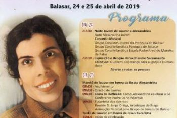 Começou ontem e prossegue amanhã a celebração do 15.º aniversário da beatificação de Alexandrina Maria da Costa. Este ano com o tema ‘Jovem: Como Alexandrina, Ser Esperança”. Uma noite jovem de louvor, com um colóquio dedicado aos mais novos e um concerto musical que integra coros juvenis e infantis de Rates e Balasar, marca o início das comemorações mais logo. Para quinta-feira, o programa festivo prevê para as 8h o início do acolhimento ao peregrino, às 9h decorrerá a oração de Laudes e às 9h30 terá lugar a reflexão “Como Alexandrina, celebrar a fé”, pelo padre Dário Pedroso. Às 10h30, D. Jorge Ortiga presidirá à Eucaristia e bênção dos doentes. Depois do almoço, haverá uma tarde de celebração eucarística dedicada a Jesus, com início da celebração às 15h, tendo como tema de reflexão ‘Crescer na Fé’. Antes da Missa Festiva (17h) haverá o Canto de Vésperas e Bênção do Santíssimo (16h). Durante todo o dia estarão padres na paróquia para proceder às confissões.