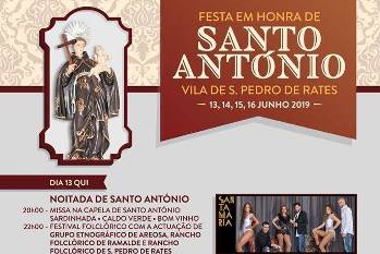 Em São Pedro de Rates estão a decorrer as Festas a Santo António. Começaram ontem, dia 13, termindando no próximo dia 16, domingo. Depois do arranque com a missa solene e um festival folclórico, esta sexta-feira à noite há sardinhada e concerto com Johnny Abreu. Amanhã, sábado, há nova sardinhada e concerto com o grupo Santamaria, fechando a noite com um espetáculo de fogo de artifício. No domingo, a missa solene será às 11h e a saída da procissão está prevista para as 15h30. As bandas de música de Vale de Cambra e Arcos de Valdevez irão atuar às 8h30 e 17h.