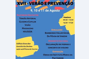 Está aí mais uma edição, a décima sétima, do Verão e Prevenção, uma realização do Rotaract Clube da Póvoa de Varzim que tem como ponto central o Diana-Bar. Até domingo vão ser efetuados rastreios gratuitos à tensão arterial, glicemia, visão, nutrição e HIV/Sida, entre as 9h30 e 17h30 com exceção do período para almoço entre as 12h30 e as 14h30. Além destes exames, refere uma informação do Rotaract, a população poderá usufruir de massagens terapêuticas hoje e amanhã das 14h30 às 17h30. Já agora fica aqui o resto do programa paralelo: amanhã haverá lugar para um momento cultural com a declamação de poemas com acompanhamento de violino e no domingo dois momentos: às 10h00, os Bombeiros Voluntários da Póvoa de Varzim vão levar a cabo um simulacro e às 15h00, será realizada uma Ação de Formação de Suporte Básico de Vida. A partir de hoje também vão estra expostos trabalhos de crianças do Instituto Maria da Paz Varzim.