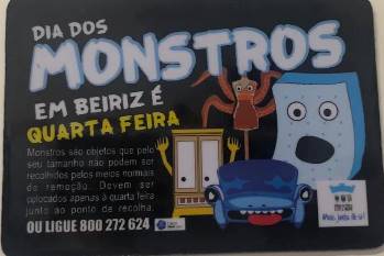 A Junta de Freguesia da Póvoa de Varzim, Beiriz e Argivai e a Câmara Municipal lançaram recentemente a Campanha ‘Dia dos Monstros’. A iniciativa andou pelas escolas de primeiro ciclo e jardins de infância para passar aos mais pequenos uma mensagem simples: monstros em Argivai só à quinta-feira e monstros em Beiriz só à quarta-feira. Esta campanha de sensibilização pretende alertar para a importância de colocar os objetos domésticos de grande dimensão apenas nos dias certos de recolha. Os colchões, móveis e eletrodomésticos que deixaram de ter utilização devem ser colocados junto dos contentores de resíduos. O presidente da união de freguesias, Ricardo Silva, entregou um folheto informativo e um íman a cada criança para reforçar a mensagem em casa, tendo sido acompanhado nesta ação pelos representantes de Beiriz, Amadeu Matias, e Argivai, Augusto Moreira, assim como pela vereadora do Ambiente, Sílvia Costa.