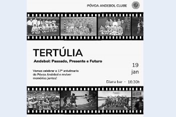 Tome atenção que a tertúlia prevista para hoje à noite no âmbito do 17.º aniversário do Póvoa Andebol foi adiada para domingo às quatro e meia da tarde no Diana-Bar. “Andebol: passado, presente, futuro” é o tema do encontro para o qual o clube convida todos os amantes da modalidade. Já agora, ainda dentro do aniversário amanhã decorre o jantar comemorativa e na manhã de domingo há teatro infantil, isto para os jogos já previstos em todas as categorias para o fim-de-semana.