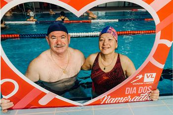 Por S. Valentim. A Varzim Lazer resolveu comemorar o amor proporcionando atividades a dois. No Dia dos Namorados, esta sexta-feira, os utentes da empresa municipal Varzim Lazer puderam convidar os seus parceiros a participarem, gratuitamente , nas as aulas lecionadas nas piscinas e no pavilhão Municipal rodeados por um ambiente de romantismo. A VL convidou a população a comemorar a data “de forma diferente e divertida” , lançando um desafia: “ faça desporto na companhia do seu parceiro”. Foi o que fizerem Maria Costa e Carlos Silva (na foto), casal que A Onda Viva entrevistou ao final da manhã, encantados com a experiência e com elogios endereçados à Varzim Lazer. O administrador José Manuel Almeida manifestou contentamento pelo êxito da iniciativa.