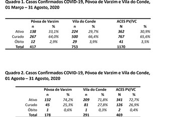 Os mais recentes dados do Agrupamento de Centros de Saúde da Póvoa de Varzim e de Vila do Conde indicam que entre os dias 1 e 31 de agosto houve 178 casos confirmados de Covid-19 na Póvoa de Varzim e 291 infetados em Vila do Conde. Até ao final do mês passado mantinham-se 132 ativos no concelho poveiro, 45 pessoas tinham recuperado e registou-se um óbito. Na mesma altura o município vilacondense apresentava 209 casos ativos, 81 pessoas estavam curadas e também se registou um falecimento. Os números do ACES PV/VC são também mais elevados que os fornecidos pela Direção Geral da Saúde em relação aos casos acumulados: 417 na Póvoa (365 segundo DGS) e 753 em V.Conde (698 de acordo com DGS). Desde o início da pandemia, em março, já se registaram 12 mortes associadas à Covid no concelho poveiro e 29 no município vilacondense.