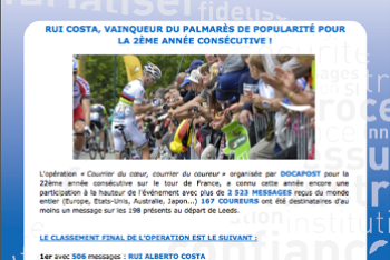 Rui Costa foi novamente o campeão da popularidade na Volta a França em bicicleta. O ciclista venceu de forma destacada esta iniciativa da promovida pela empresa que recebe e distribui a correspondência dirigida aos ciclistas durante o Tour. Rui Costa totalizou 506 mensagens e repetiu o triunfo de 2013. De acordo a Docapost, do total de 2523 cartas dirigidas a 167 corredores, o aguçadourense conseguiu cerca de um quinto das mensagens.
