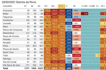 A Póvoa de Varzim teve 54 infetados entre 14 e 20 de fevereiro e em Vila do Conde o registo do mesmo período foi de 91 infetados. O documento aponta uma descida de pessoas infetadas em relação à penúltima semana, entre 7 e 13 de fevereiro, altura em que se registaram 85 casos no município poveiro (uma queda de 36 por cento) e 107 casos no município vilacondense (uma queda de 15 por cento).