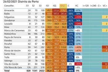 A Póvoa de Varzim teve 43 infetados entre 18 e 24 de fevereiro e em Vila do Conde o registo do mesmo período foi de 81 infetados. O documento aponta uma descida de pessoas infetadas em relação à penúltima semana, entre 11 e 17 de fevereiro, altura em que se registaram 61 casos no município poveiro (uma queda de 30 por cento) e 84 casos no município vilacondense (uma queda de 4 por cento).