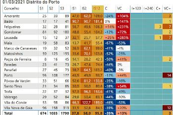 Os números indicam ainda que a Póvoa de Varzim mantinha no passado dia 1, segunda-feira, uma incidência cumulativa de 134 casos em 14 dias por cada 100 mil habitantes (84 casos reais), enquanto Vila do Conde apresentava 189casos em 14 dias por cada 100 mil habitantes (151 casos reais). Em termos médios, nas duas últimas semanas, surgiram apenas 6 novas infeções por dia no concelho poveiro, sendo essa média ligeiramente inferior a 11 novos infetados diariamente no concelho vilacondense.