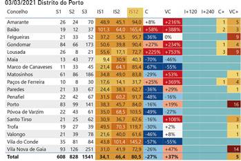 Os números indicam ainda que a Póvoa de Varzim mantinha no passado dia 3, quarta-feira, uma incidência cumulativa de 103 casos em 14 dias por cada 100 mil habitantes (65 casos reais), enquanto Vila do Conde apresentava 145 casos em 14 dias por cada 100 mil habitantes (116 casos reais). Em termos médios, nas duas últimas semanas, surgiram menos de 5 novas infeções por dia no concelho poveiro, sendo essa média ligeiramente superior a 8 novos infetados diariamente no concelho vilacondense.