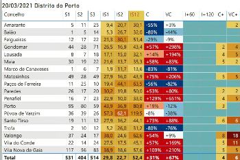 A Póvoa de Varzim teve 36 infetados entre 14 e 20 de março e em Vila do Conde o registo do mesmo período foi de 22 infetados. Em relação à penúltima semana, entre 7 e 13 de março, o documento aponta uma descida de pessoas infetadas no município poveiro ( houve 39 casos e a queda é de 8%) e uma subida no município vilacondense (houve 14 casos e uma subida de 57%).