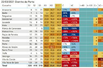 A Póvoa de Varzim mantinha uma incidência cumulativa de 117,9 casos em 14 dias por cada 100 mil habitantes (74 casos reais), enquanto Vila do Conde apresentava 45,1 casos em 14 dias por cada 100 mil residentes (36 casos reais), sendo estes números melhores e mais atuais que os publicados pela Direção Geral da Saúde na passada segunda-feira. Em termos médios, nas duas últimas semanas, surgiram pouco mais de 5 novas infeções por dia no concelho poveiro, sendo essa média inferior a 3 novos infetados diariamente no concelho vilacondense.