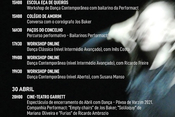 A Associação Nós da Dança preparou um programa alusivo ao Dia Mundial da Dança que se celebra esta quinta-feira. Às três da tarde decorrerá na Escola Secundária Eça de Queirós uma oficina de Dança Contemporânea com a presença de um bailarino da Performact e à mesma hora às 15h00, no Colégio de Amorim, o coreógrafo Jos Baker estará à conversa com os presentes numa sessão especial. Às 16h30, os Paços do Concelho acolhem a atuação de bailarinos Performact e depois começam três sessões de aprendizagem através da Internet: às 17h30 com Inês Costa para um nível intermédio avançado de dança clássica, e uma hora depois, para o mesmo patamar de exigência, mas para expressão contemporânea, a sessão de aprendizagem será conduzida por Ricardo Freire, terminando este ciclo dos chamados “worshops” com a abordagem por Susana Manso e num nível aberto, à dança mais moderna. Na sexta-feira à noite, a Associação Nós da Dança leva a efeito no cineteatro Garrett, às 20h30, um espetáculo de encerramento deste mês de Abril dedicado à dança, com a presença em palco da Companhia Perfomact que vai interpretar “Empty chairs”, uma criação de Jos Baker ainda “Soliloquy” idealizado por Mariana Oliveira e “Fúrias” por Ricardo Ambrozio.A entrada para este espetáculo é gratuita até lotação da sala, mediante levantamento do respetivo ingresso no cine-teatro Garrett