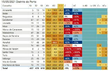 A Póvoa de Varzim mantinha a 15 de maio, segundo a ARSN, uma incidência cumulativa de 17,5 casos em 14 dias por cada 100 mil habitantes (11 casos reais), enquanto Vila do Conde apresentava 26,3 casos em 14 dias por cada 100 mil residentes (21 casos reais). Isto equivale a 32 casos somando as duas localidades e estes números seguem muito abaixo da linha de risco de um travão ou recuo no desconfinanento.