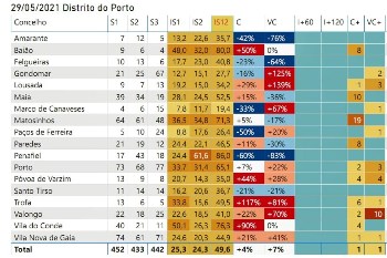 A Póvoa de Varzim mantinha a 29 de maio, segundo a ARSN, uma incidência cumulativa de 35 casos em 14 dias por cada 100 mil habitantes (22 casos reais), enquanto Vila do Conde apresentava 76,3 casos em 14 dias por cada 100 mil residentes (61 casos reais). Isto equivale a 83 casos somando as duas localidades na última quinzena e estes números seguem abaixo da linha de risco de um travão ou recuo no desconfinanento.