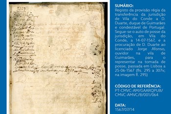 Tem a data de 14 de julho, como hoje portanto, mas de 1567, aquele que o Arquivo Municipal vilacondense considera o “Documento do mês”. Trata-se do “Auto de posse” de Vila do Conde por D. Duarte, duque de Guimarães e condestável de Portugal. Esta iniciativa autárquica de divulgar um documento mensalmente surgiu a 9 de junho, na sequência do Dia Internacional dos Arquivos, e visa divulgar o “vastíssimo acervo do Arquivo, dando prossecução à missão de preservar e comunicar o conteúdo informativo dos fundos documentais à sua guarda e que são de valor inestimável para o estudo da história de Vila do Conde”.