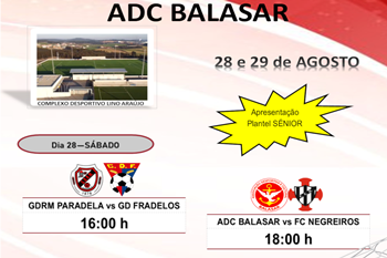 O Complexo Desportivo Lino Araújo é palco este fim de semana de um torneio quadrangular. A Associação Desportiva e Cultural de Balasar, que milita na Divisão de Honra da Associação de Futebol do Porto, vai apresentar a equipa sénior aos sócios. Este sábado, os balasarenses defrontam o Negreiros a partir das 18h. Duas horas antes jogam Paradela e Fradelos. No domingo, nos mesmos horários, jogam primeiro os derrotados do dia anterior e depois realiza-se a grande final entre os vencedores. O clube salienta que é permitida a presença de público e que é preciso cumprir as normas.