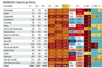 A Póvoa de Varzim mantinha a 28 de agosto, segundo a ARSN, uma incidência cumulativa de 360 casos em 14 dias por cada 100 mil habitantes (226 casos reais), enquanto Vila do Conde apresentava 289 casos em 14 dias por cada 100 mil residentes (231 casos reais).