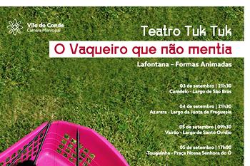 Agosto terminou, mas continua a viagem do Teatro Tuk Tuk, um projeto da Companhia Lafontana—Formas Animadas que procura levar a todo o território de Vila do Conde a peça “O Vaqueiro que não mentia”, sendo o palco um pequeno veículo motorizado urbano, o tal “tuk tuk” (na imagem). As sessões são gratuitas e divertidas e esta sexta-feira à noite, às 21h30, estará em Canidelo, no Largo de São Brás, e amanhã à mesma hora será a vez de Azurara, perto da sede da junta. No domingo haverá duas sessões: às 9h30 e em Vairão, no Largo de Santo Ovídio, e `s cinco da tarde em Touguinha, na praça Nossa Senhora do Ó. “Do ponto de vista do conteúdo dramatúrgico – refere a divulgação - o espetáculo “O vaqueiro que não mentia” é uma história popular muito antiga recolhida em diferentes regiões portuguesas, ou mesmo no Brasil”.