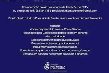 A Escola Municipal de Música da Póvoa de Varzim tem aberto o período de possíveis entradas para o seu Coro Juvenil, o Coro Juvenil Pró-música. Para tal os jovens interessados, com idades entre os 12 e os 18 anos, têm de se submeter a uma audição depois de se inscrevem através de um prévio contacto para o estabelecimento de ensino (252 614 145) ou diretamente nos serviços de receção da escola. No cartaz de divulgação deste período de entrada pode ler-se que é um “projeto aberto a toda a Comunidade Poveira, alunos, ex-alunos, demais interessados”.”.Os requisitos de participação são vários , mas à cabeça está o “possuir gosto pelo Canto e pela prática vocal em conjunto”