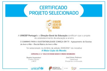 A Escola Básica de Aver-o-Mar foi selecionada para integrar o livro digital "A Maior Lição do Mundo". O trabalho “O caminho para sustentabilidade começa em ti!”, desenvolvido pela professora Graça Pinheiro e respetivos alunos, foi um dos 12 selecionados pelos elementos da UNICEF e da Direção Geral da Educação, no âmbito edição 2020-2021. O projeto visava dar a conhecer os Objetivos de Desenvolvimento Sustentável, fomentar a reflexão em torno das alterações climáticas e contribuir para uma cidadania global ativa e uma maior consciencialização do papel de cada um na construção de um mundo mais seguro, mais saudável e mais sustentável. A iniciativa contou com a colaboração da Câmara Municipal da Póvoa de Varzim e da Horpozim.