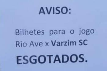 Esgotaram rapidamente os 200 bilhetes a 5 euros que o Rio Ave disponibilizou ao Varzim para o dérbi do próximo domingo. Quem agora se dirigir à sede varzinista vai deparar-se com um aviso na porta a alertar para essa situação. Falta agora saber se os rioavistas vão colocar à venda entradas para o público em geral.