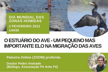 Esta quarta-feira, 2 de fevereiro, é o Dia Mundial das Zonas Húmidas e em Vila do Conde o CMIA- Centro de Monitorização e Interpretação Ambiental promove uma palestra intitulada “O estuário do Ave – um pequeno mas importante elo na migração das aves” que vai ser proferida pelo investigador Pedro Andrade, biólogo e dirigente da Associação Pé Ante Pé, uma instituição sem fins lucrativos, que tem como objetivo a “observação, divulgação e conservação da natureza e da biodiversidade”. Pode assistir gratuitamente à intervenção, pela internet, ou seja pela plataforma Zoom, se fizer a inscrição no endereço aqui até às 11h00. O CMIA explica que “este dia tem como objetivo aumentar a consciência global acerca do papel vital das zonas húmidas para a humanidade e para o planeta”.