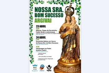 Este é um fim de semana de festa na freguesia de Argivai, na Póvoa de Varzim com o tributo a Nossa Senhora do Bom Sucesso. Este sábado ao final da tarde, às 19h30, no Salão Villa Argevadi haverá comes e bebes com o intuito de serem angariado fundos para restauros a ser levados a efeito pela Igreja. Domingo tem às 11 da manhã a Eucaristia Solene e às três e meia da tarde decorrerá, na capela, uma homenagem ao padre Avelino Castro com a presença da fadista Sílvia Raquel e do poeta Aurelino Costa.