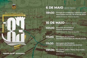 O Rio Ave Futebol Clube começa esta-feira a desenvolver o programa festivo dos 83 anos de existência, com a entrega de emblemas ou diplomas aos sócios com 50 ou 25 anos de filiação. Vai ser às sete da tarde na sede na Praça da República. O resto do programa fica para o dia 10, terça feira- com a romagem aos cemitérios de Vila do Conde e das Caxinas e a Eucaristia Solene, na Igreja Matriz, “pelos sócios falecidos”.