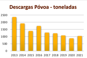 E sim, fomos ver os números da pesca na Póvoa. Recorrendo a números trabalhados e cedidos à Onda Viva pelo jornalista José Manuel Rocha foi possível constatar que as descargas de pescado na lota da Póvoa de Varzim diminuíram, entre 2013 e 2020, praticamente de forma contínua e substancial. Nesse período, a redução foi de mais de metade, passaram de pouco mais de duas mil toneladas para menos de mil em 2020, se bem que no ano passado (2021) já houve um ligeiro acréscimo, mas ainda assim muito longe dos números de 2013. Consequentemente o peso das descargas na Póvoa no total nacional também diminuiu. Passou de quase 1,6 por cento em 2013 para pouco mais de 0,7 por cento no ano passado, uma regressão . Os dados foram trabalhados com base são do Datapescas, publicação estatística da Direcção-geral das Pescas.