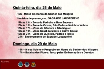 A partir desta quinta-feira na freguesia poveira de Argivai começa a ser prestada homenagem a Nosso Sr. dos Milagres, num tributo que terá o ponto alto no domingo às quatro da tarde com a Missa Solene e Pregação e às sete com a “batalha de flores e um terço pelas embarcações e devotos. Esta quinta-feira há uma missa às 10 da manhã e, ao longo do dia,. até às 21h00, os fiéis de diversos lugares da freguesia vão estar presentes no Sagrado Lauresperene