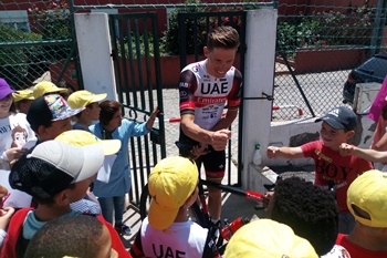 Rui Costa tirou fotografias com estudantes e docentes, tendo ainda pedalado durante alguns minutos com os jovens, que fizeram desenhos e prepararam um trabalho com mensagens de apoio ao ciclista da UAE Emirates que recentemente esteve na Volta a Itália e e em breve vai regressar à ação na Volta à Eslovénia.