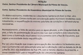 Um grupo de moradores de Aver-o-Mar entregou uma petição a solicitar à autarquia a realização de obras de requalificação no Aldeamento de Santana e na zona envolvente. O documento conta com 78 assinaturas e foi dirigido aos presidentes da Câmara e da Assembleia Municipal, sendo Ana Rita Sencadas a primeira signatária.