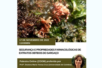 A participação é gratuita através da plataforma Zoom (link aqui) e a palestra denomina-se “Segurança e Propriedades Farmacológicas de Extratos Obtidos do Sargaço”.