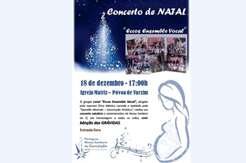 Às cinco da tarde deste domingo, na Igreja Matriz da Póvoa de Varzim, há um concerto pelo grupo Coral “Eccos Ensemble Vocal” que é dirigido pela soprano lírica Mónica Lacerda e tem tutela da associação artística “Questão abstrata”. Lê-se na divulgação que o evento é “comemorativo de Nossa Senhora do Ó, em homenagem a todas as mães, com bênção das grávidas”. A entrada será gratuita.