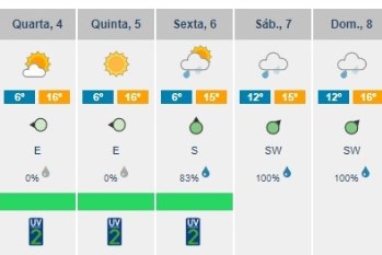 Esta semana tem sido de sol, pouco vento e algum frio, sobretudo noturno, na região norte. Depois do mau tempo no final de 2022, o arranque do novo ano está a ser marcado pelo céu azul predominante, mas o que é bom parece estar para terminar já no próximo fim de semana. A meteorologia agradável ainda vai perdurar até à tarde da próxima sexta-feira, mas nessa noite e no sábado de madrugada já chega a chuva e esta regressa em força para ficar uns dias, acompanhada de vento moderado. As nuvens vão ser mesmo o prato forte de sábado e de domingo, com a agitação marítima também a ser uma realidade, especialmente no dia 8. As temperaturas mínimas nesse período é que vão aumentar dos 6 graus destes dias para a casa dos 12 graus a partir de sábado, permanecendo as máximas sem grandes alterações, na casa dos 15/16 graus.