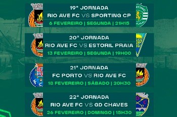 A Liga divulgou hoje o calendário de jogos para fevereiro e o Rio Ave ficou a saber com o que conta depois do jogo em Vizela na tarde do próximo domingo. Assim, na jornada 19 os rioavistas recebem o Sporting no dia 6, uma segunda-feira, pelas 21h15. Depois, no dia 13, outra segunda-feira, há novo jogo em casa com o Estoril às 19h. Segue-se a visita ao terreno do Porto no dia 18, um sábado, com início às 20h30. Finalmente, a receção ao Chaves, na jornada 22, será no dia 26, um domingo, às 15h30. Todas as partidas terão relato na Rádio Onda Viva.