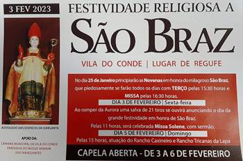 Estão aí as festas em honra de S. Braz, Vila do Conde, organizadas pela Confraria do Senhor dos Navegantes. Às 11 horas da manhã desta 6.ª feira decorre uma "Eucaristia Solene" e fica aberta capela que é de devoção também para muitos poveiros já que fica bem na fronteira das duas cidades. Sinal disso é que no domingo, às três da tarde haverá um espetáculo pelos Ranchos Caxineiro e Tricanas da Lapa.
