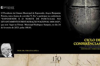 Esta sexta-feira prosseguem a s conferências mensais alusivas aos 450 anos de Esposende. Às seis e meia da tarde no Fórum Municipal vai falar José Viriato Capela que é professor catedrático da Universidade do Minho, investigador na Universidade do porto e membro da Academia Portuguesa de História. Escolheu para mote da sua intervenção : “Esposende e o Norte de Portugal no levantamento e rastauração nacional 1808-1820.”