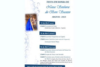 É esta sexta-feira que em Argivai, na Póvoa de Varzim, começam as festas em honra de Nossa Senhora do Bom Sucesso. E principiam às nove da noite com a saída de uma procissão de velas da rua Conde Calheiros e até à capela onde no sábado, às cinco da tarde, sucede a Eucaristia Vespertina. À noite, às sete da tarde, no Salão da Junta de Freguesia acontece um jantar-convívio com a animação do DJ Joel Maya.