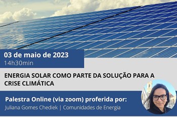 3 de maio, hoje é o Dia Internacional do Sol e o O Centro de Monitorização e Interpretação Ambiental (CMIA), de Vila do Conde, organiza às duas e meia da tarde uma palestra, pela Internet, por Juliana Gomes Chedieck que falará sobre o tema “Energia Solar como parte da solução para a crise climática” Todos podem assistir,desde que façam uma inscrição aqui