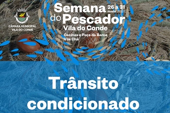 Hoje é o último dia da Semana do Pescador, que está a decorrer em Vila do Conde. A esse propósito, o primeiro destaque vai para a interrupção do trânsito, até 13h00, na Av. Infante D. Henrique, entre a Av. Bento Martins Júnior e a Rua Senhor dos Navegantes, devido à transmissão televisiva das Comemorações do Dia Nacional do Pescador.
