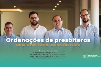 O Bispo do Porto, D. Manuel Linda, vai ordenar, hoje, às 16h00, quadro novos padres. Na cerimónia, que vai decorrer na Sé do Porto, vão ser ordenados Bruno Miguel Coelho Aguiar (pároco de Moreira da Maia), Filipe Ramos dos Santos (de Malta, Vila do Conde), João Miguel Moreira Azinheira (de São João da Madeira) e Pedro Manuel Lopes da Cunha (de Paredes).