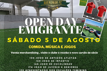 O Averomar FC vai organizar, amanhã, o Open Day Emigrante. Entre as 10h00 e as 19h00, o campo do clube estará aberto a todos para mostrar as modalidades e os seus escalões. Haverá comida, música e muitos jogos.