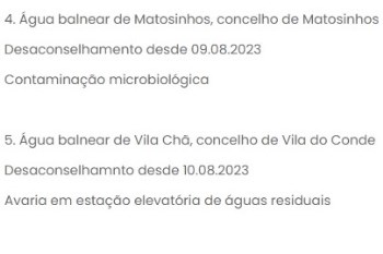 A água balnear de Vila Chã, em Vila do Conde, foi alvo de desaconselhamento pela Agência Portuguesa do Ambiente. A decisão vigora desde 10 de agosto, ou seja a passada quinta-feira, segundo se pode verificar no site da APA (foto ao lado).