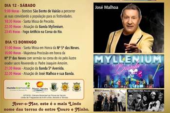 Aver-o-Mar está em festa em honra de Nossa Senhora das Neves. Este sábado há missa às 18h30, atuação da Banda Myllenium às 22h30 e fogo de artifício na Coroa do Rio um pouco antes da meia-noite. No domingo, a Eucaristia Solene é às onze da manhã, enquanto à tarde sai a procissão às 16h e à noite haverá também grande animação: às 21h30 atua a Banda 5ª Avenida e uma hora depois sobe ao palco o popular José Malhoa.